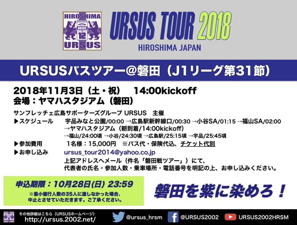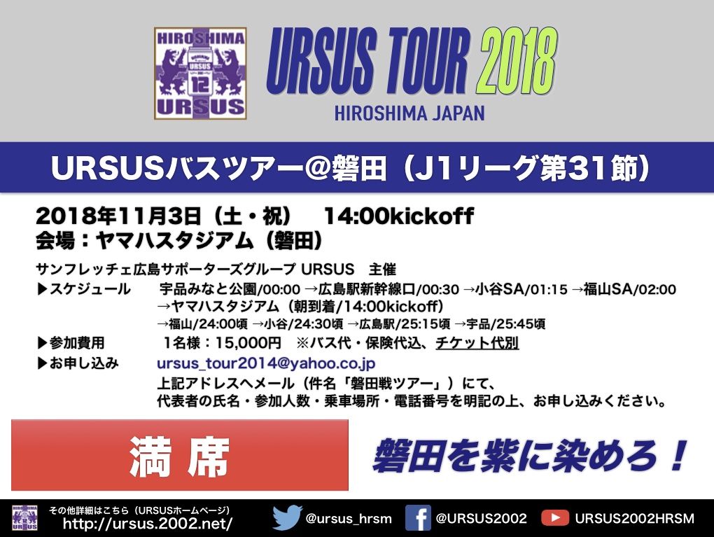 2018年11月3日(土・祝)にヤマハスタジアム(磐田)にて開催されるJ1リーグ第31節ジュビロ磐田戦ですが、URSUSではバスツアーを企画いたしましたのでご案内いたします。